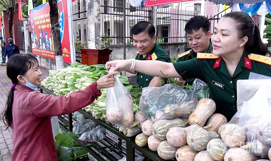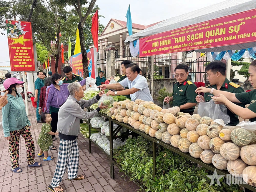 Tại chương trình, các cán bộ, chiến sĩ đã tặng người dân có hoàn cảnh khó khăn gần 750kg rau, củ, quả các loại, đều là sản phẩm tăng gia sản xuất của cán bộ, chiến sĩ Ban chỉ huy Phòng thủ khu vực 2 - Phú Lợi và ban CHQS 6 xã, phường trong cụm; đồng thời trao 20 phần quà gồm gạo và các nhu yếu phẩm hỗ trợ 20 hộ gia đình khó khăn.