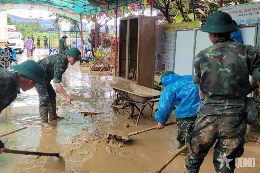 Cô Đinh Hoàng Phương Thủy, Hiệu trưởng Trường Mầm non Sơn Giang (thôn Vĩnh Lương, xã Đức Bình) tâm sự: “Nước ngập quá tầng 2, toàn bộ máy móc, trang thiết bị, đồ dùng phục vụ cho công tác giảng dạy, học tập lẫn lộn trong bùn đất, rơm rạ. Tôi chỉ biết khóc, không biết bắt đầu từ đâu. Với khối lượng công việc khổng lồ, nhưng nhờ sự vào cuộc của bộ đội, chỉ hơn một ngày, trường trở nên ngăn nắp, gọn gàng”.