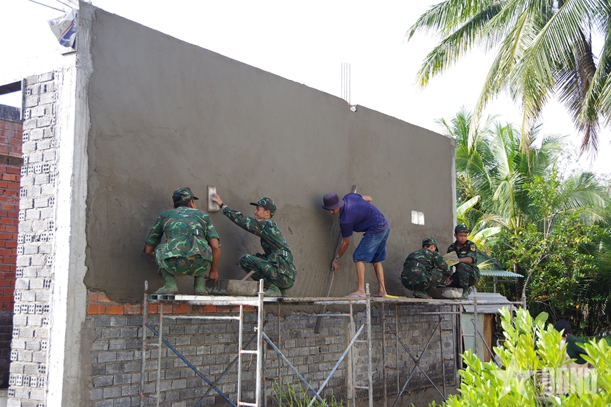 Cán bộ, chiến sĩ Trung đoàn 3 phối hợp cùng nhân dân địa phương xây dựng “Nhà đồng đội”.
