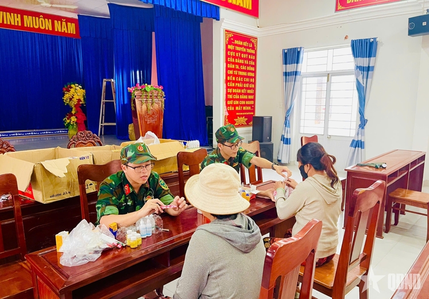 | Các bác sĩ Bệnh viện Quân y 17 (Cục Hậu cần - Kỹ thuật Quân khu) thăm khám, tư vấn sức khỏe, cấp thuốc cho người dân. |