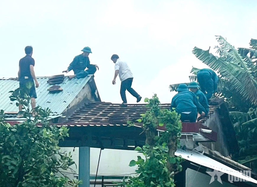 | Các lực lượng giúp người dân thôn Phú Đa 2 (xã Thu Bồn, TP Đà Nẵng) lợp lại nhà sau lốc xoáy. |