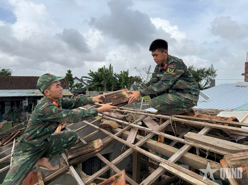| Cán bộ, chiến sĩ Tiểu đoàn Trinh sát 32 (Bộ Tham mưu Quân khu 5) giúp các gia đình thôn Phú Lương (phường Đông Hòa, tỉnh Đắk Lắk) sửa lại nhà. |