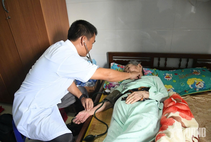 Bác sĩ của Chi đội Kiểm ngư số 3 thăm khám sức khỏe cho Mẹ Việt Nam anh hùng Ngô Thị Cang.