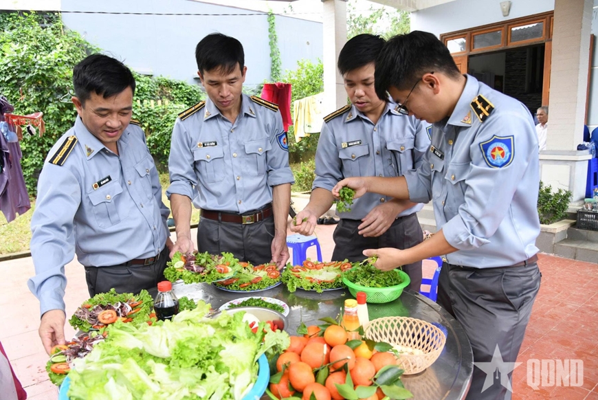 | Cán bộ, nhân viên Chi đội Kiểm ngư số 3 chuẩn bị mâm cơm tại gia đình Mẹ Việt Nam anh hùng Ngô Thị Cang. |