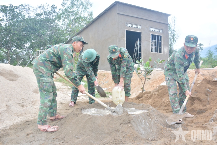 | Cán bộ, chiến sĩ Trung đoàn 974 nỗ lực hoàn thành nhiệm vụ xây nhà. |