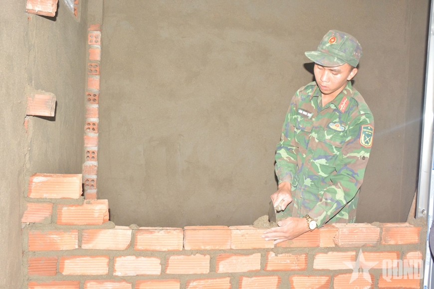 | Chiến sĩ thuần thục kỹ thuật xây tường nhà. |