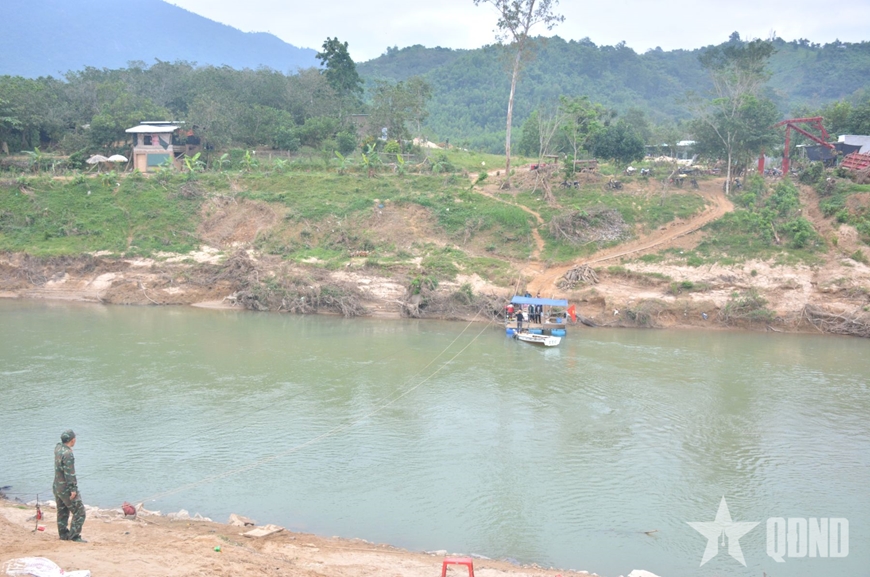 | Bộ đội Trung đoàn 974 sử dụng phương tiện chở vật liệu qua sông để xây nhà. |