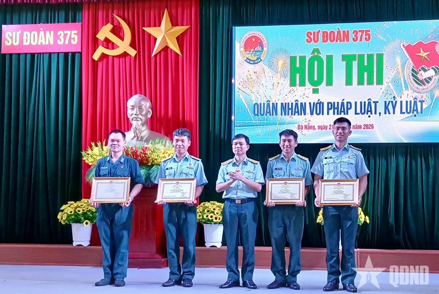 Trung sĩ Nguyễn Hải Triều (bên trái) nhận thưởng tại Hội thi “Quân nhân với pháp luật, kỷ luật” do Sư đoàn Phòng không 375 tổ chức.