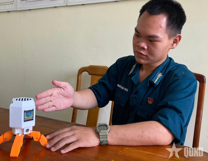 Trung sĩ Nguyễn Hải Triều giới thiệu mô hình sáng kiến “Trợ lý ảo cho quân nhân”.