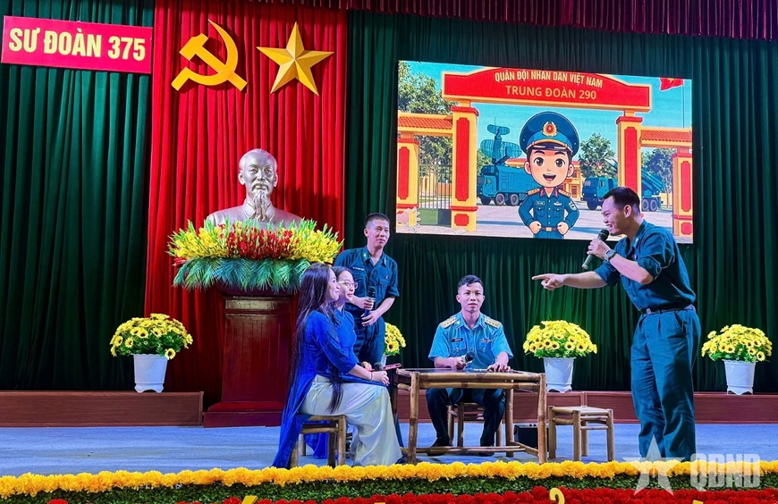 Trung sĩ Nguyễn Hải Triều (bên phải) tham gia Hội thi “Quân nhân với pháp luật, kỷ luật” do Sư đoàn Phòng không 375 tổ chức.