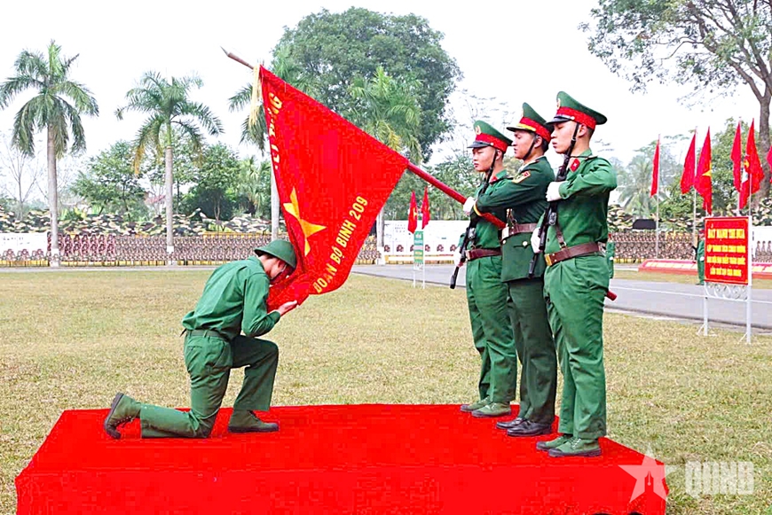 Chiến sĩ xuất ngũ của Trung đoàn 209, Sư đoàn 312 thực hiện nghi thức hôn Quân kỳ trong Lễ tiễn quân nhân hoàn thành nghĩa vụ quân sự tại ngũ năm 2026. Ảnh: PHẠM MINH