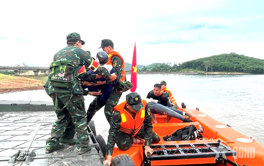 Tại Lữ đoàn Công binh 414, buổi huấn luyện vượt sông cứu nạn đúng vào thời điểm trời đổ mưa. Vậy nhưng, cán bộ, chiến sĩ đơn vị vẫn thoăn thoắt thao tác vận chuyển ca nô ra vị trí cơ động; thực hành lắp máy, triển khai vật dụng sào, dây, phao cứu sinh... Chỉ trong ít phút, chiếc ca nô đã đến vị trí cứu nạn. Lúc này, từng cán bộ, chiến sĩ tung phao cứu sinh, dây, sào, lao mình xuống nước bơi cứu hộ, sơ cứu người bị đuối nước... Tất cả diễn ra nhịp nhàng, nhanh chóng.