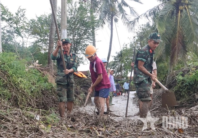 | Cán bộ, chiến sĩ Trung đoàn 584, Bộ CHQS tỉnh Đắk Lắk giúp nhân dân dọn dẹp đường sá tại thôn Vạn Lộc, xã Hòa Mỹ. |