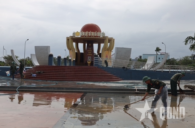 Bộ đội Trung đoàn 66, Sư đoàn 10, Quân đoàn 34 dọn vệ sinh tại Tượng đài liệt sĩ phường Đông Hòa.