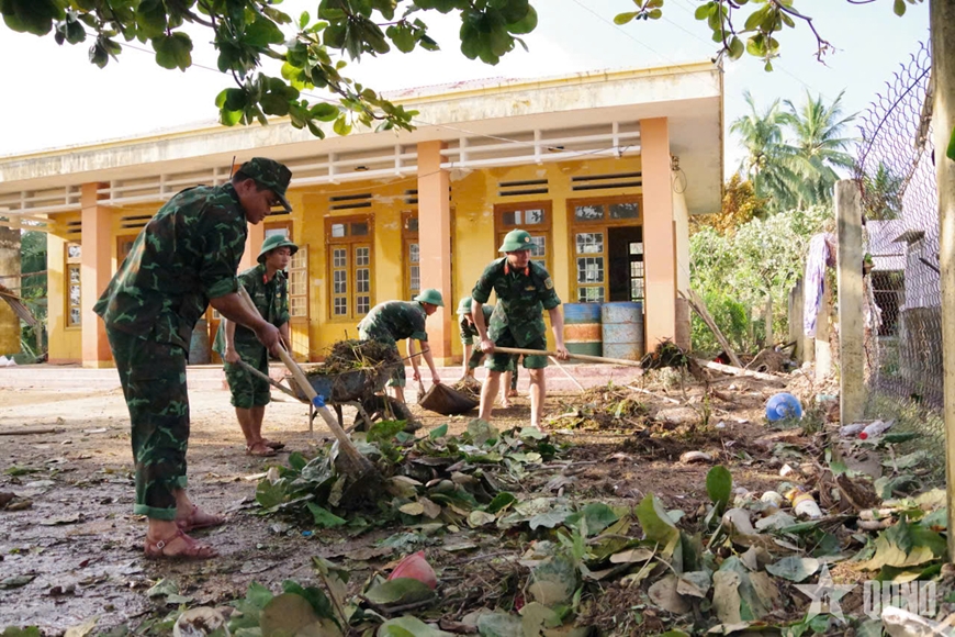 Tại các khu vực khác, Ban chỉ huy Phòng thủ Khu vực 3 (Ea Súp) và Khu vực 6 (Tuy Hòa) cùng lực lượng công an, dân quân đã tổ chức cắt tỉa cây đổ, thu dọn bùn đất, vệ sinh 5 trường học, 5 trạm y tế và hỗ trợ đưa người dân trở lại nhà khi nước rút. Các đồn Biên phòng 348, 352, 354... phối hợp với chính quyền địa phương dọn dẹp 45 cây xanh, trụ điện gãy đổ, cứu 2 người dân bị mắc kẹt, hỗ trợ dọn 46 nhà dân và 1 trường tiểu học bị hư hại.