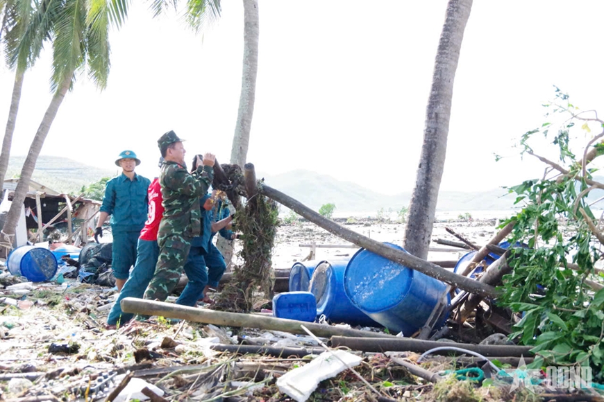 Tại phường Sông Cầu, địa bàn chịu ảnh hưởng nặng nhất, tuyến đường huyết mạch chạy qua thôn Phú Mỹ bị tê liệt hoàn toàn. Cây lớn gãy đổ chắn ngang đường, nhiều lồng bè nuôi thủy sản của bà con bị sóng đánh trôi dạt, tràn lên mặt đường. Gắn bó với vùng đất này hàng chục năm, ông Trần Ngọc Lâm, thôn Phú Mỹ, vẫn chưa hết bàng hoàng trước sức tàn phá của cơn bão. Ông chia sẻ: “Nhà cửa, hoa màu và lồng bè nuôi thủy sản của gia đình cũng như nhiều hộ dân đều thiệt hại nặng. Nhờ các anh bộ đội đến giúp, bà con chúng tôi mới biết bắt đầu dọn dẹp từ đâu.”