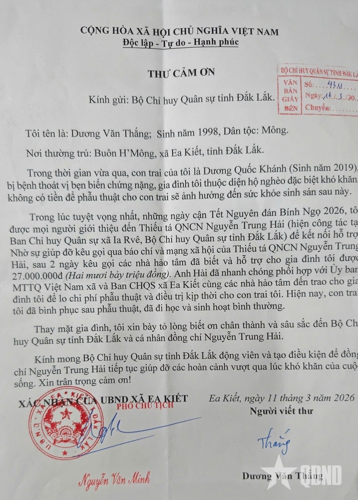 Thư cảm ơn của anh Dương Văn Thắng gửi đến Bộ CHQS tỉnh Đắk Lắk.