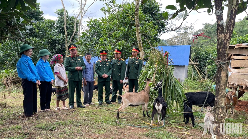 | Đoàn Kinh tế-Quốc phòng 337 hỗ trợ dê sinh sản, hướng dẫn kỹ thuật chăn nuôi cho gia đình bà Hồ Thị Bay (xã Hướng Phùng, tỉnh Quảng Trị). |