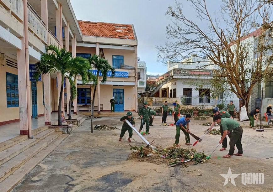 | Đồn Biên phòng Nhơn Lý giúp địa phương khắc phục hậu quả bão số 13. |