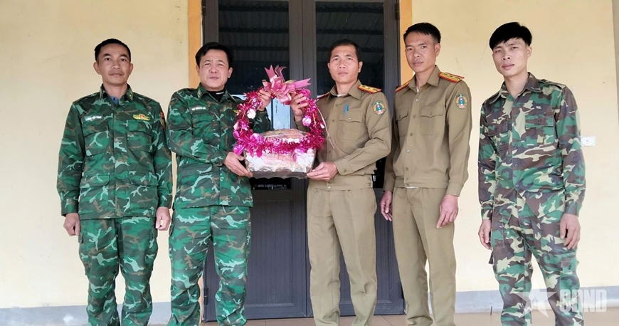 | Tổ công tác Biên phòng bản Huồi Mới đón đơn vị bảo vệ biên giới của Lào sang chúc mừng năm mới. |