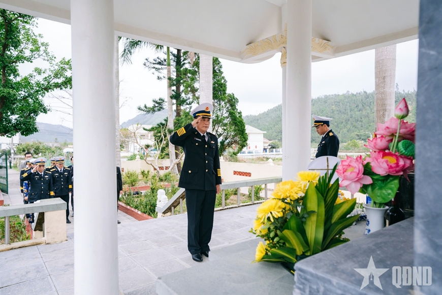 | Đại tá Hoàng Trung Dũng cùng đoàn công tác thắp hương tại đài tưởng niệm các anh hùng liệt sĩ ở đảo Trần. |