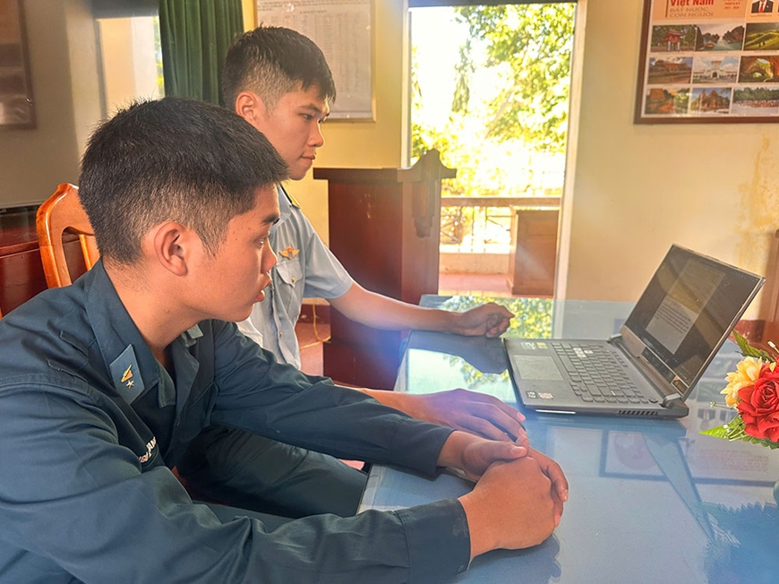 | Cán bộ, chiến sĩ Tiểu đoàn 118, Trung đoàn 274 ứng dụng công nghệ trong tìm hiểu lịch sử, truyền thống. |