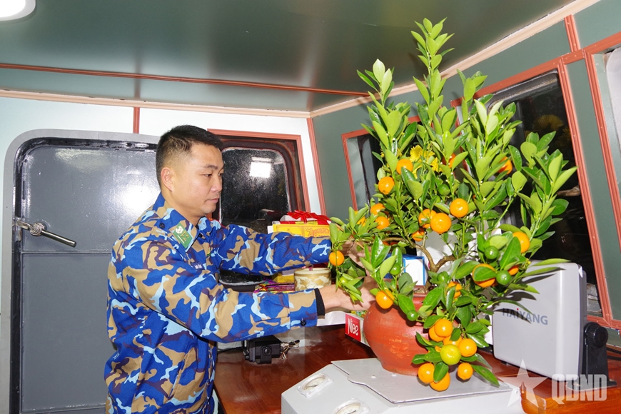 | Cùng với sẵn sàng chiến đấu, những người lính Biên phòng chuẩn bị đầy đủ hương vị Tết. Năm nay là năm thứ 16 Đại úy Hoàng Văn Hải trực Tết ở đơn vị, anh đang chuẩn bị sửa soạn Tết trên tàu tuần tra. |
