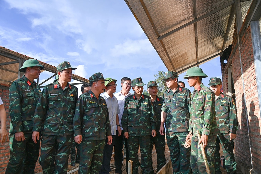 Lãnh đạo Quân khu 2 kiểm tra, động viên cán bộ, chiến sĩ thi công tại khu tái định cư bản Háng Pu Xi, xã Xa Dung, tỉnh Điện Biên. |