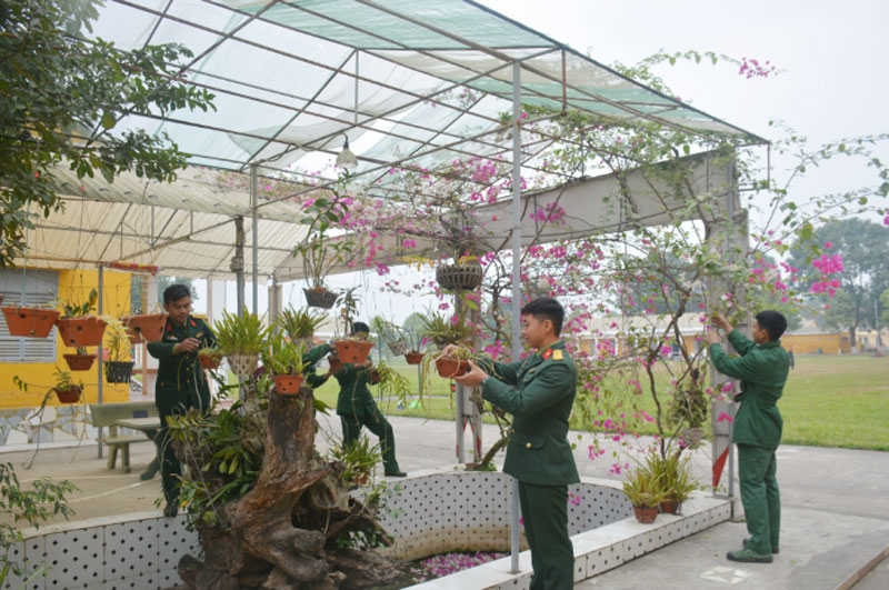 | Cán bộ, chiến sĩ Tiểu đoàn 1, Lữ đoàn Pháo binh 368, Quân đoàn 12 chăm sóc cây cảnh trong giờ nghỉ. |