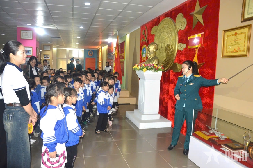 | Các em nhỏ Trường Mầm non Trung Sơn Trầm, phường Tùng Thiện tham quan Nhà Truyền thống Học viện Phòng không - Không quân. |