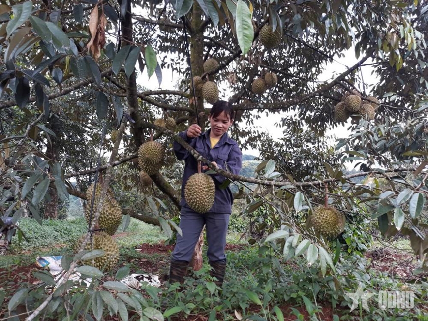 Hội viên Phụ nữ Trung đoàn 720 chăm sóc vườn sầu riêng, mô hình tăng gia sản xuất, phát triển kinh tế hiệu quả của đơn vị.