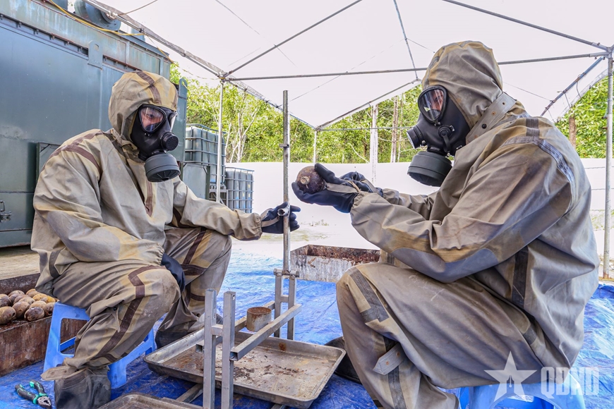 Dưới cái nắng gắt của miền Đông Nam Bộ, cán bộ, chiến sĩ Tiểu đoàn Hóa học 38, Bộ Tham mưu Quân khu 7 vẫn miệt mài kiểm tra thiết bị, vận hành hệ thống điều khiển lò đốt trong môi trường luôn nồng nặc mùi hóa chất, nhiệt độ cao, áp lực lớn. Trung sĩ Nguyễn Trần Bá Ý, Đại đội Tiêu tẩy khói, Tiểu đoàn Hóa học 38 chia sẻ: “Lần đầu vào ca xử lý chất độc, tôi có lo lắng vì ảnh hưởng sức khỏe lâu dài. Nhưng được trang bị đầy đủ kiến thức nên tôi và đồng đội luôn vững tâm. Nhiệm vụ chiến đấu thời bình của chúng tôi chính là dọn sạch những tàn dư chiến tranh, những thứ không nhìn thấy bằng mắt nhưng có thể hủy hoại cả môi trường sống”.