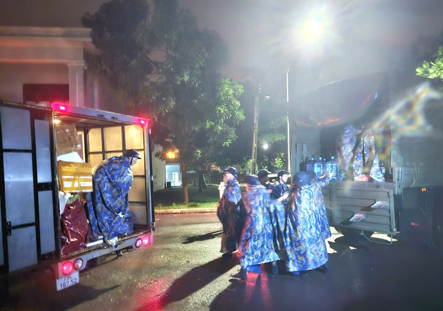 | Cán bộ, chiến sĩ vận chuyển nhu yếu phẩm lên xe cơ động giúp nhân dân. |