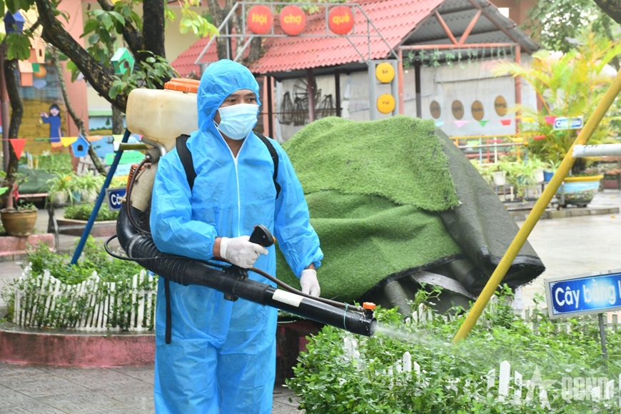 Nhận được đề nghị hỗ trợ từ Ban giám hiệu nhà trường, sáng 6-11, Ban Quân y, Phòng Hậu cần - Kỹ thuật Bộ CHQS thành phố Huế đã điều động lực lượng tiến hành tiêu độc khử trùng, vệ sinh môi trường, sắp xếp bàn ghế, đồ dùng học tập để đón học sinh trở lại học tập.