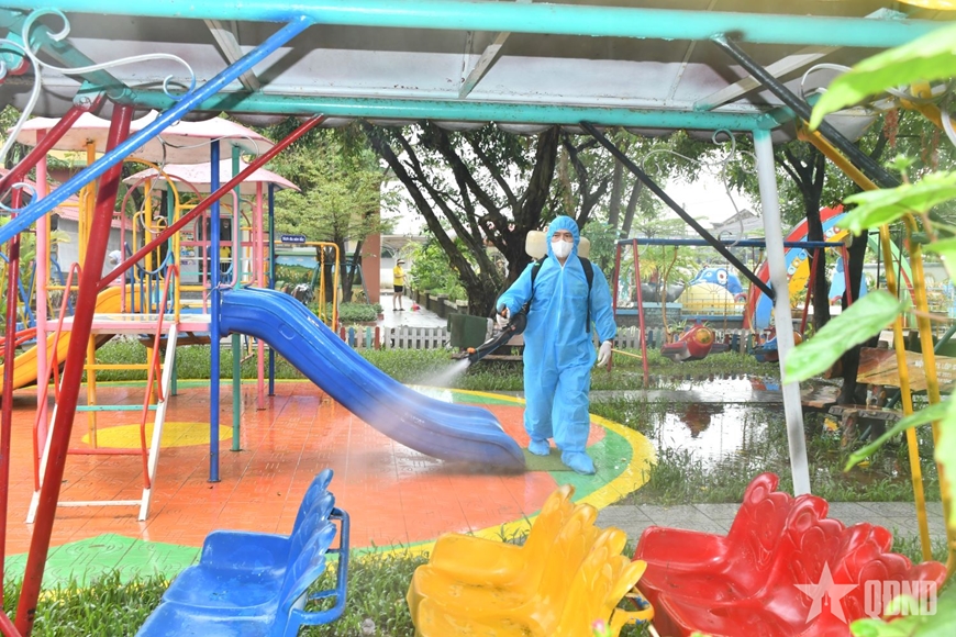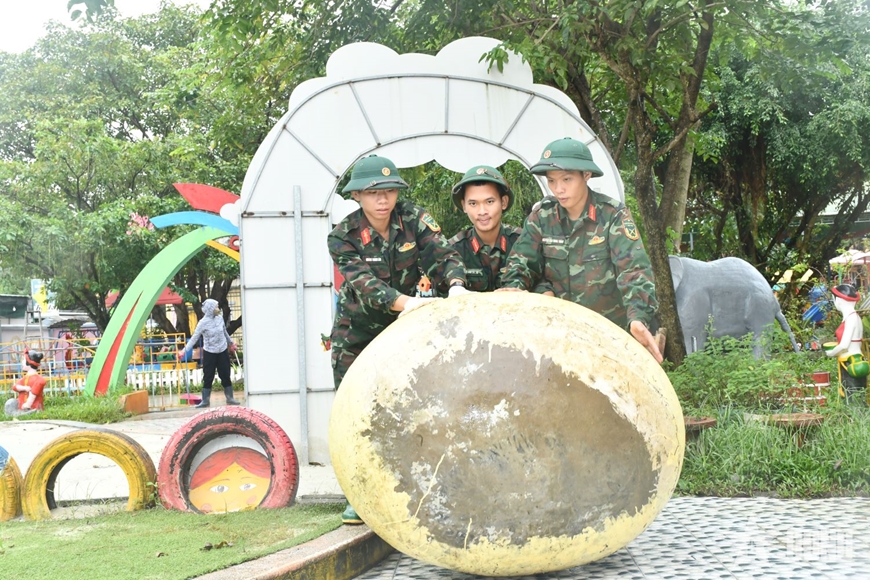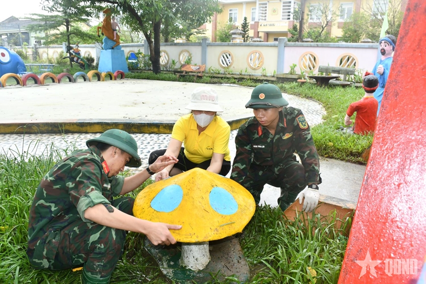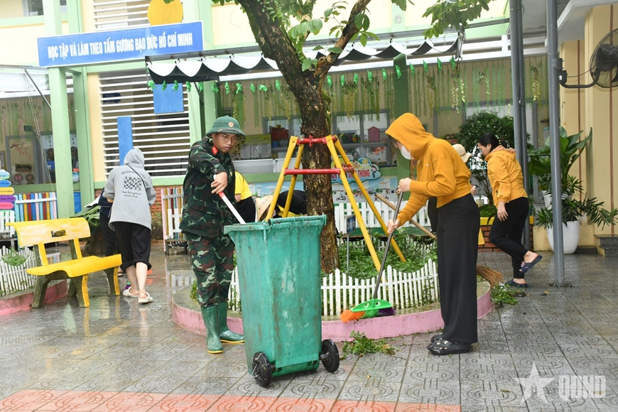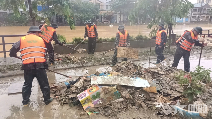 Theo đó, cán bộ, chiến sĩ đơn vị đã phối hợp thu gom khoảng 180 tấn rác thải, hơn 83m3 bùn đất; tổng dọn vệ sinh hơn 10km đường giao thông; gần 39.000m2 khuôn viên các trường học, trạm y tế, công trình công cộng, chợ dân sinh… Ngày 6-11, đơn vị tiếp tục điều động gần 200 cán bộ, chiến sĩ dọn bùn đất, rác thải, khử khuẩn, vệ sinh môi trường ở các khu dân cư, trường học, trạm y tế trên địa bàn.
