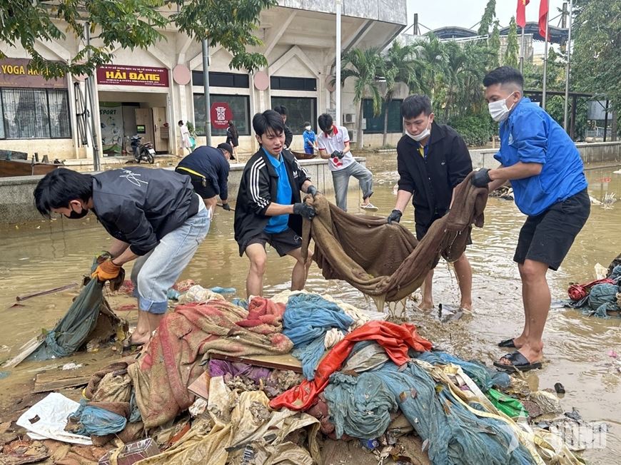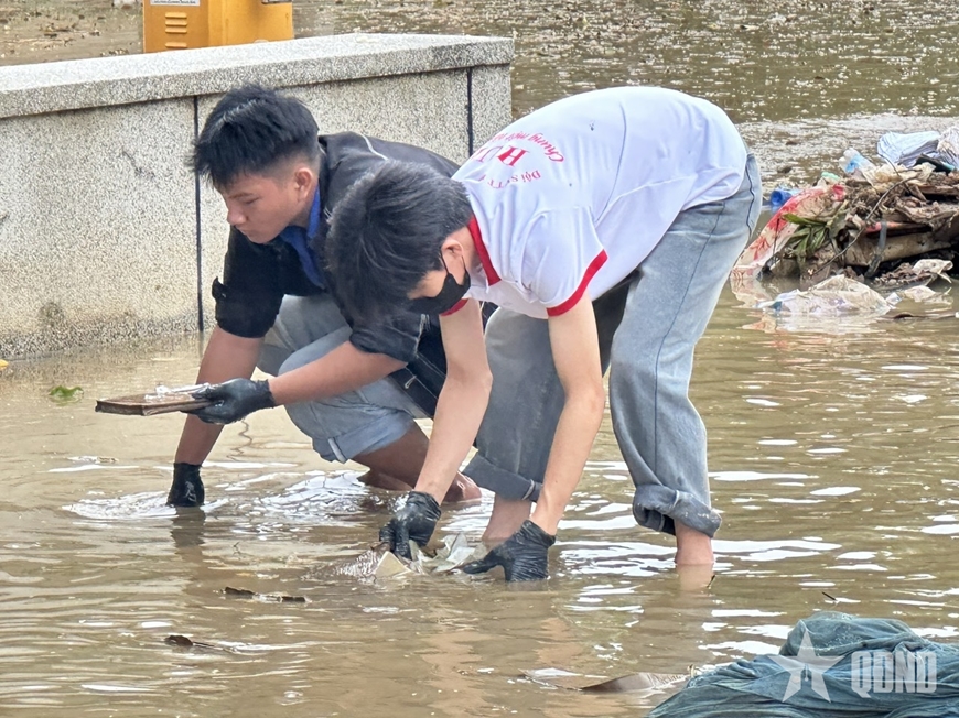 | Đoàn viên, thanh niên, sinh viên các trường cao đẳng, đại học chung sức dọn lũ trên đường Lê Quý Đôn. |