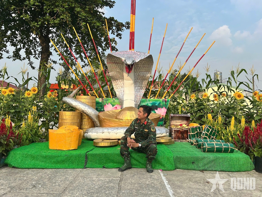| Mô hình linh vật rắn quấn quanh thỏi tiền vàng và bánh chưng, bánh tét tại Trung đoàn 1 (Sư đoàn 9, Quân đoàn 34) mang nhiều ý nghĩa tinh thần trong ngày đầu năm. |