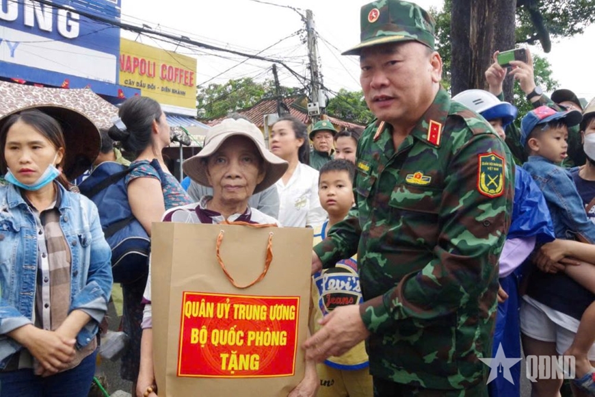 | Trung tướng Lê Quang Đạo, Phó tổng Tham mưu trưởng QĐND Việt Nam trao quà của Bộ Quốc phòng tặng người dân bị thiệt hại nặng tại Khánh Hòa. |