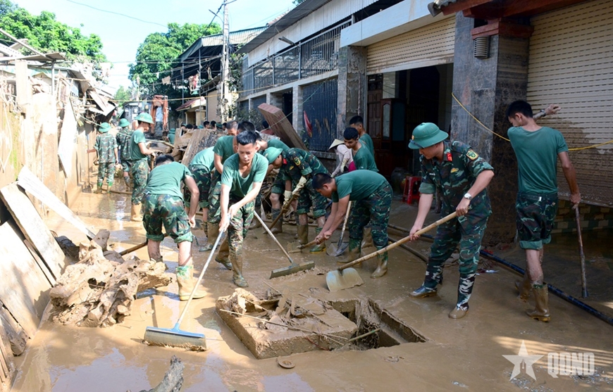 Cán bộ, chiến sĩ Trung đoàn 1, Sư đoàn 324 (Quân khu 4) giúp nhân dân xã Tương Dương (Nghệ An) khắc phục bão số 3 (tháng 7-2025). Ảnh: KHÁNH TRÌNH |