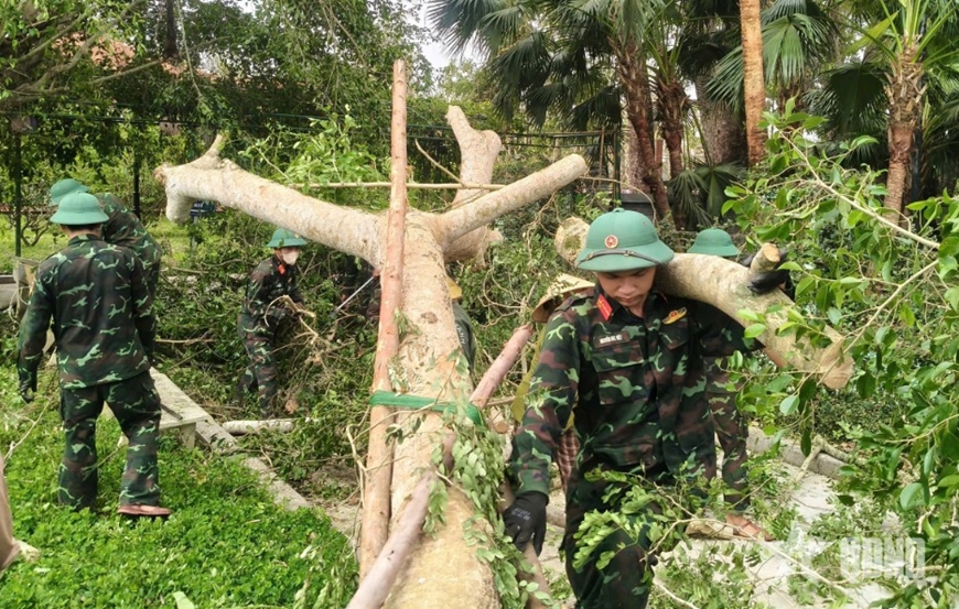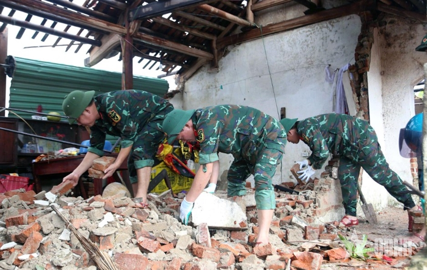 Đồng chí Nguyễn Quang Khánh, Phó chủ tịch UBND xã Hoằng Giang cho biết: “Bão tố làm đổ sập, hư hỏng gần 300 ngôi nhà của dân trong xã. Địa phương đã huy động tổng lực để dọn dẹp, khắc phục nhưng vẫn còn rất ngổn ngang, hậu quả quá nặng nề. Rất may có bộ đội về giúp để bà con sớm có nơi ở”.