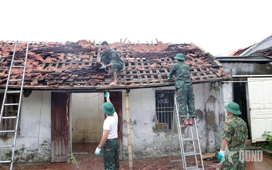 Ban chỉ huy Phòng thủ khu vực 2-Hà Trung (Bộ CHQS tỉnh Thanh Hóa) giúp dân sửa nhà sau bão tại xã Hoằng Giang, tỉnh Thanh Hóa. Ảnh: KHÁNH TRÌNH |