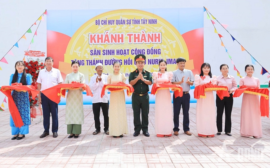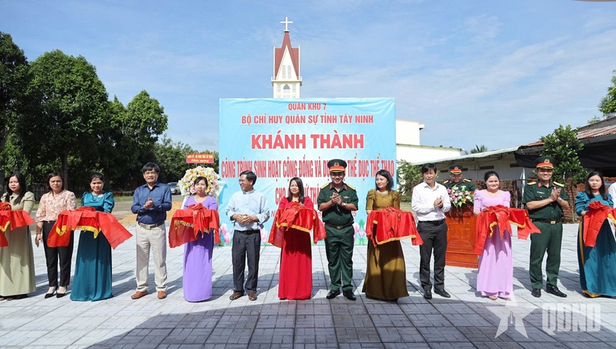 | Bộ CHQS tỉnh Tây Ninh phối hợp khánh thành công trình văn hóa, thể thao tặng cơ sở tôn giáo trên địa bàn. Ảnh: NHÂN NGUYỄN |