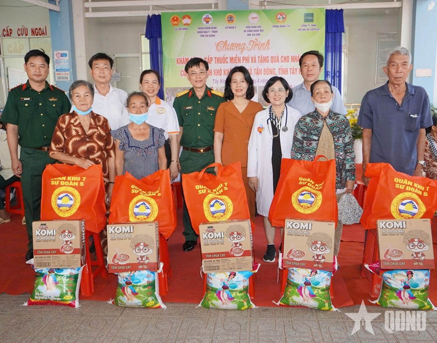 | Sư đoàn 5 (Quân khu 7) phối hợp trao quà tặng đồng bào Khmer, người dân khó khăn tại tỉnh Tây Ninh, tháng 4-2026. Ảnh: THUẬN NGUYỄN |