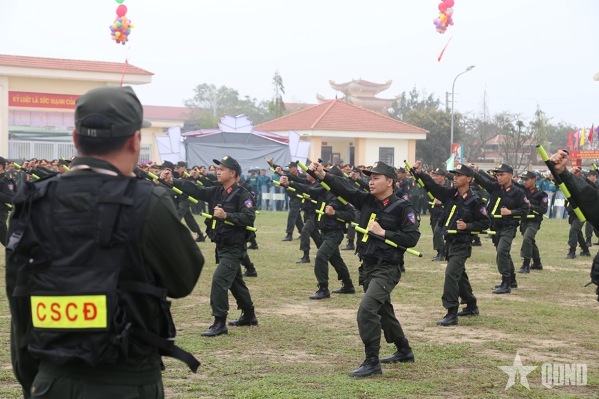 Không khí càng thêm sôi động với bài quyền Tonfa của cán bộ, chiến sĩ Trung đoàn Cảnh sát cơ động Bắc Trung Bộ. Những thế đánh nhanh, mạnh, chắc, kết hợp linh hoạt giữa tay, chân và gậy Tonfa cho thấy trình độ kỹ thuật thuần thục, khả năng hiệp đồng chặt chẽ và bản lĩnh chiến đấu vững vàng.