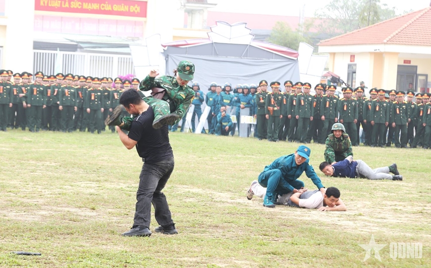 | Cán bộ, chiến sĩ Đại đội Trinh sát-Cơ giới, Phòng Tham mưu, Bộ CHQS tỉnh Nghệ An trình diễn bài quyền 45 động tác dao găm kết hợp 38 động tác võ tay không. |