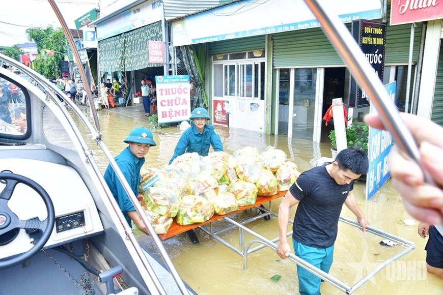 Ngày 2-10, trên địa bàn xã Tân An, tỉnh Nghệ An, nước lũ chưa rút hết. Giữa mênh mông biển nước, từng đoàn cán bộ, chiến sĩ Bộ CHQS tỉnh Nghệ An, nhất là Ban chỉ huy PTKV 5-Anh Sơn cùng lực lượng dân quân tự vệ kiên trì bám địa bàn, giúp dân vượt qua khó khăn. Lũ trên sông Con dâng cao khiến 13/21 xóm của xã bị ngập nặng, trong đó 7 xóm bị cô lập hoàn toàn. Gần 500 ngôi nhà chìm sâu trong nước. Bộ đội, dân quân chia thành nhiều mũi, dùng xuồng, ca nô, xe chuyên dụng để tiếp tế lương thực, nước uống, đưa người già, trẻ nhỏ, phụ nữ đến nơi an toàn. Những ngày qua, hơn 60 cán bộ, chiến sĩ bộ đội thường trực cùng hơn 700 dân quân tự vệ phối hợp chặt chẽ với chính quyền địa phương, không chỉ di chuyển người và tài sản mà còn trực tiếp san dọn, dựng lại những căn nhà tốc mái, hư hỏng. Khi màn đêm buông xuống, nước sông Con bắt đầu rút, lực lượng quân sự vẫn duy trì trực, không để người dân đơn độc trong bão, lũ.