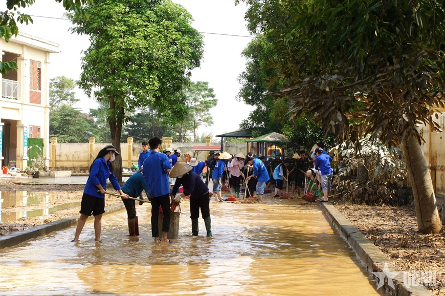 Bên cạnh người dân thôn Diên Lộc, đoàn viên thanh niên các thôn Yên Vỹ, Thiểm Xuyên,... cũng có mặt từ sớm, hỗ trợ vận chuyển rác, kê lại đồ đạc, giúp các hộ dân sớm ổn định sinh hoạt.