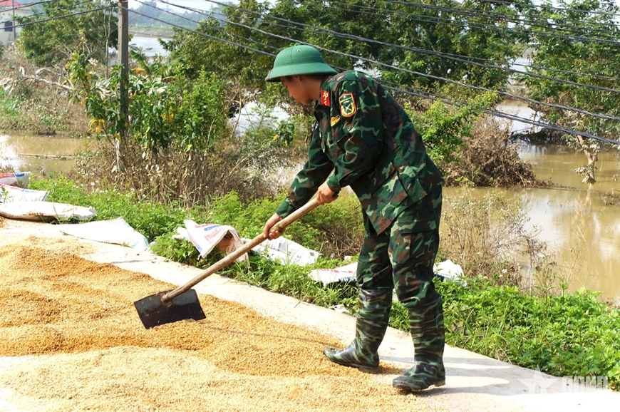 Trên những con đường còn lấm bùn, từng nhóm người hối hả xúc đất, quét nước, thu gom rác. Ở đường đê đã khô ráo, bộ đội hỗ trợ bà con phơi lại thóc. Bàn tay các chiến sĩ công binh hết đắp đê, xúc cát, cào bùn đến nắm từng nắm thóc quý của nhân dân, cẩn thận phơi khô trên tuyến đê Diên Lộc.