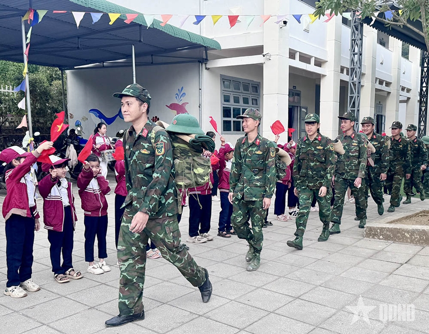 | Các cháu học sinh tiễn chân chú bộ đội. |