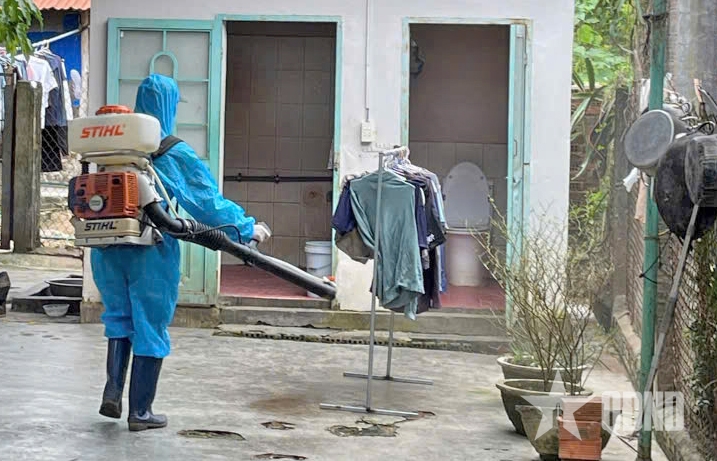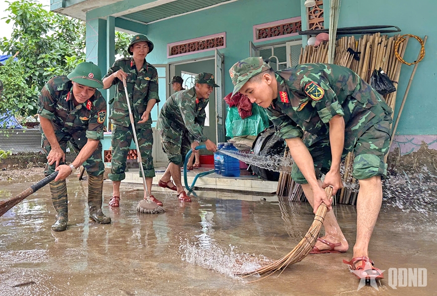 | Chiến sĩ Lữ đoàn 7 khử khuẩn nhà dân để phòng, chống dịch bệnh sau lũ. |